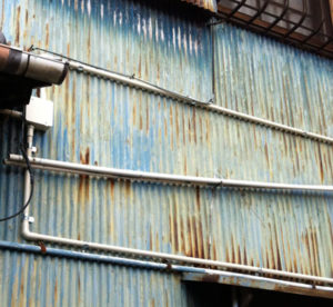 今回の現場の外壁面はトタン貼りの為、トタンを張るときの下地の木にしっかりとサドルのビスが届くように位置を確認しながらビニールパイプを配管していきます。