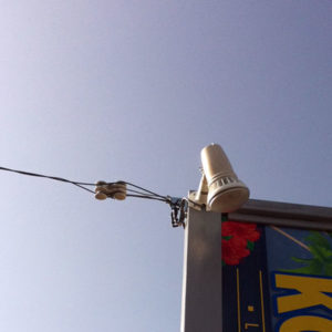 屋外看板が設置されている場所が会社建屋から離れは場所に設置されているので配管配線工事で施工すると車で配管を踏んで破損してしまう恐れがありました。担当者様と打ち合わせの結果、架空配線工事での施工方法となりました。