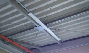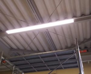 照明を増設したい場所を確認したところ、天井下部にホイストが通る場所でしたので水銀灯タイプのような照明ですとホイストを動かしたと時に当たってしまう可能性がありましたので、蛍光灯110WタイプのLED照明をご提案しました。