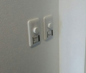 天井のクロス(壁紙)が貼り終わったらダウンライト本体(LEDダウンライトOD361204BC)を設置していきます。今回の現場はダウンライト(LEDダウンライトOD361204BC)を調光できるように調光機能が付いたスイッチを設置して行きます。