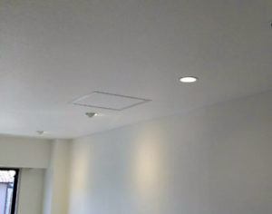 今回の現場は、天井に点検口があるので点検口より天井裏を確認しながらダウンライト設置位置の天井にダウンライト設置開口をあけていきます。