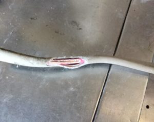 上記の写真のように漏電の原因は貫通穴のトタン部分と電線が擦れて電線の銅の部分とトタンがあたっていて漏電している状態でした。