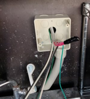 壁に穴をあけた場所にジョイントボックスを設置、食洗機まで新たに配線し直すことでブレーカ(サーキットブレーカBCW330)の絶縁抵抗値100MΩまで回復しましたので、ブレーカーONにして食洗機が使用出来るようになりました。