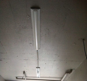 LED照明器具(パナソニック一体型LEDベースライト)は振動ドリルで穴をあけてアンカーを打ってLED照明を固定していきます。同じように2台設置しました。