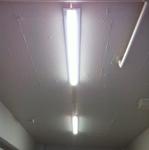 まずは駐輪場の照明工事を行います。LED照明器具はV型蛍光灯型40W×2灯用相当の明るさで光色が昼白色のLED照明器具(パナソニック一体型LEDベースライト)を設置配線工事を行っていきます。