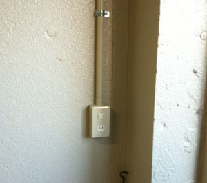 オーナー様よりコンセントは1か所でスイッチの場所と同じ場所に設置できないかとのご依頼でしたので上記写真のように露出ボックスにスイッチ(パナソニックWN5001P)とコンセント(パナソニックWN1001P)を設置しました。配線工事はVVF1.6×3芯(富士電線 VVFケーブル)で配線しました。